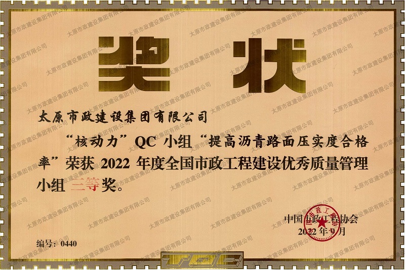 資質(zhì)證書 營業(yè)執(zhí)照 2022年度市政工程最高質(zhì)量水平評價_H5-1路道路及配套工程(二標段) 2022年度工程建設誠信典型企業(yè) 中國施工企業(yè)管理協(xié)會_AAA級企業(yè)信用等級 2022年度全國市政工程建設優(yōu)秀質(zhì)量管理小組三等獎_''核動力QC小組”提高瀝青路面壓實度合格率”